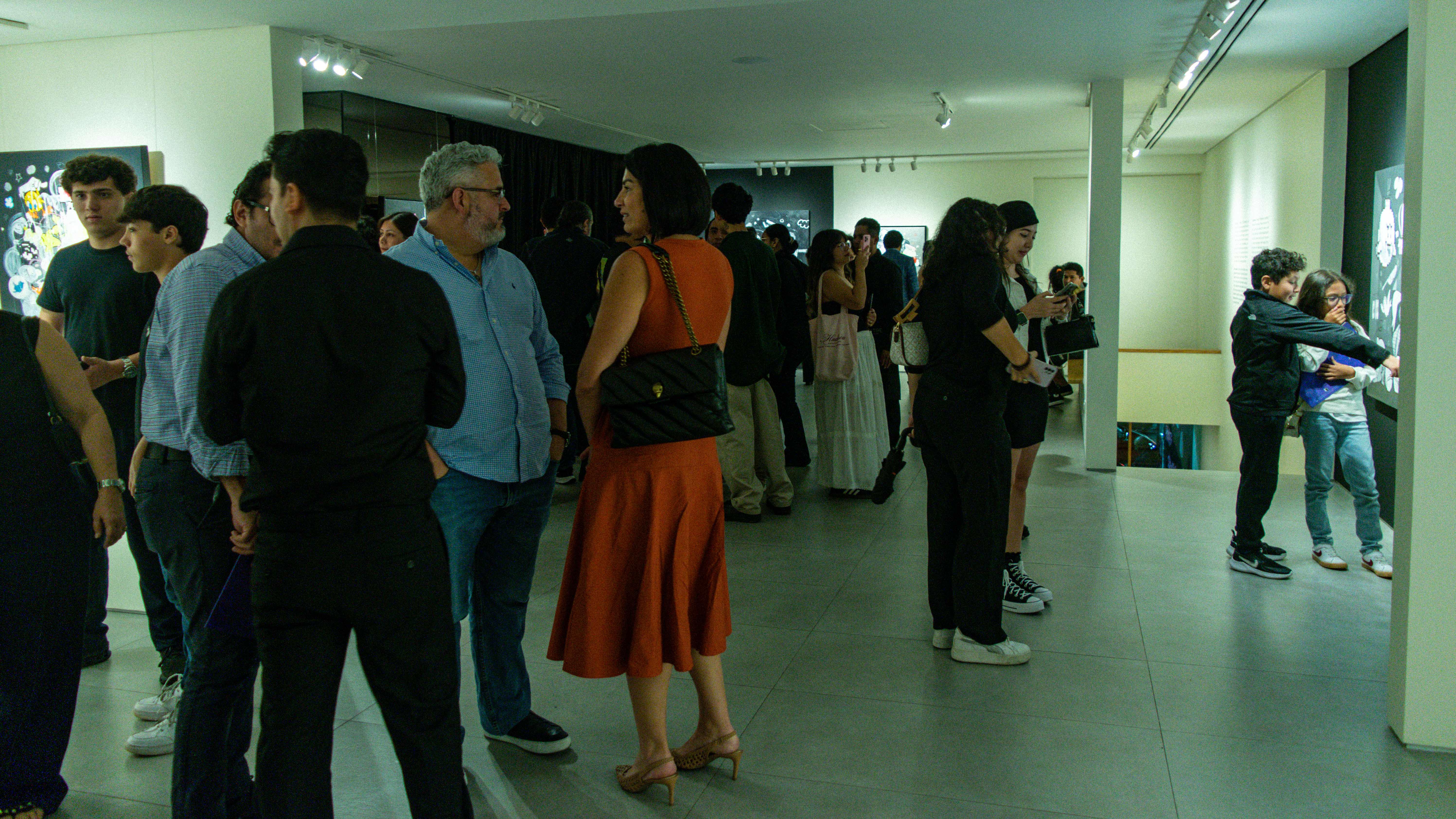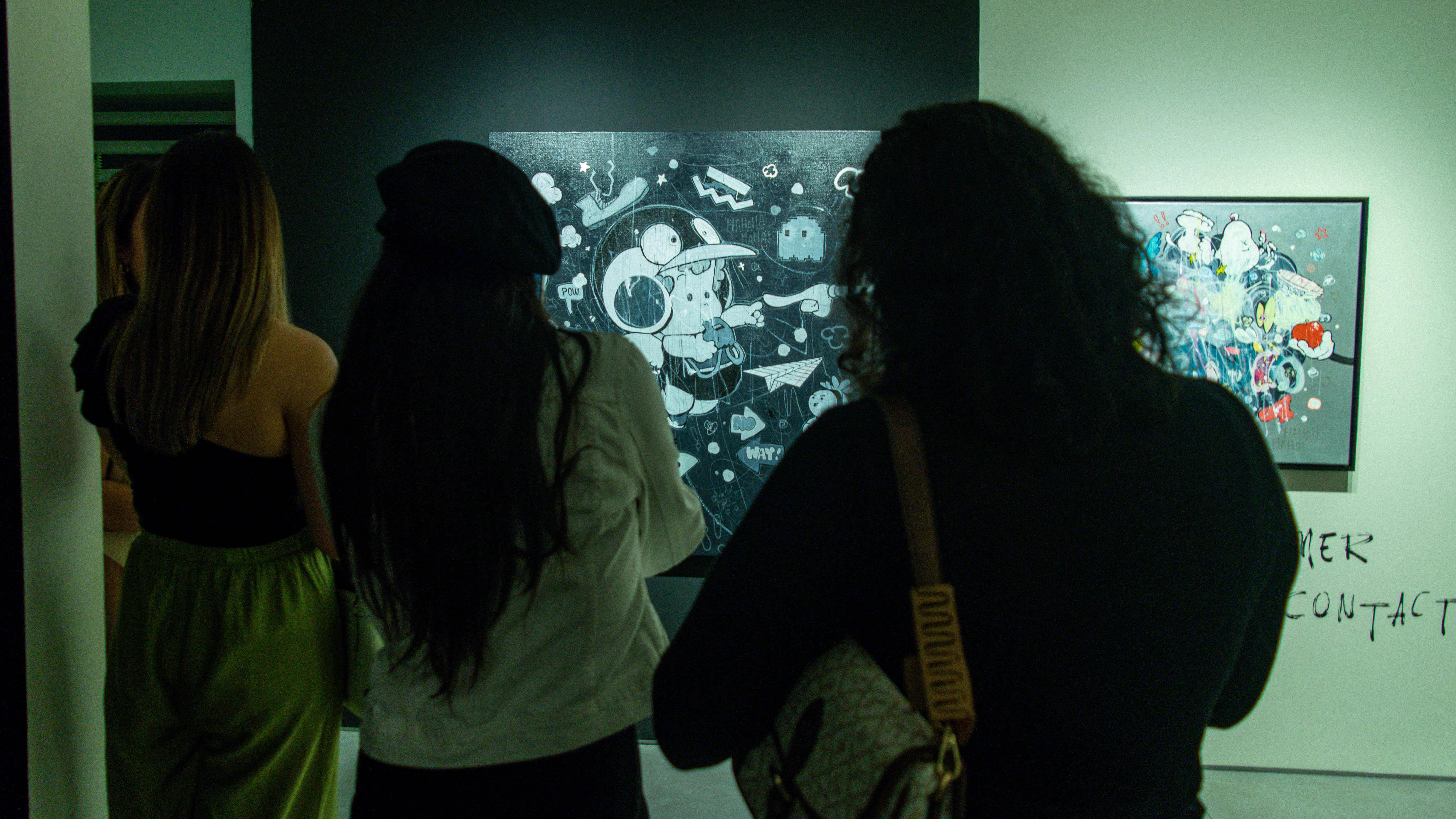 Este gesto de tocar es también el gesto de entrar. Contacto no solo sintetiza el tema de la exposición: lo encarna. El artista-niño que, por primera vez, se atreve a tender la mano hacia el afuera, sin saber si encontrará respuesta. La museografía refuerza esta tensión. A su lado, Correteo, una obra de composición caótica, comparte un eje invisible, un canal simbólico. Incluso el color de los muros se divide: blanco y negro, como umbral, como dualidad, como metáfora de los dos mundos que esta exposición busca reunir. Lo íntimo y lo público, lo abrumador y lo revelador, el ruido y la quietud. Todo se equilibra por una sola línea: el gesto suspendido de una mano que se extiende buscando ese primer contacto.