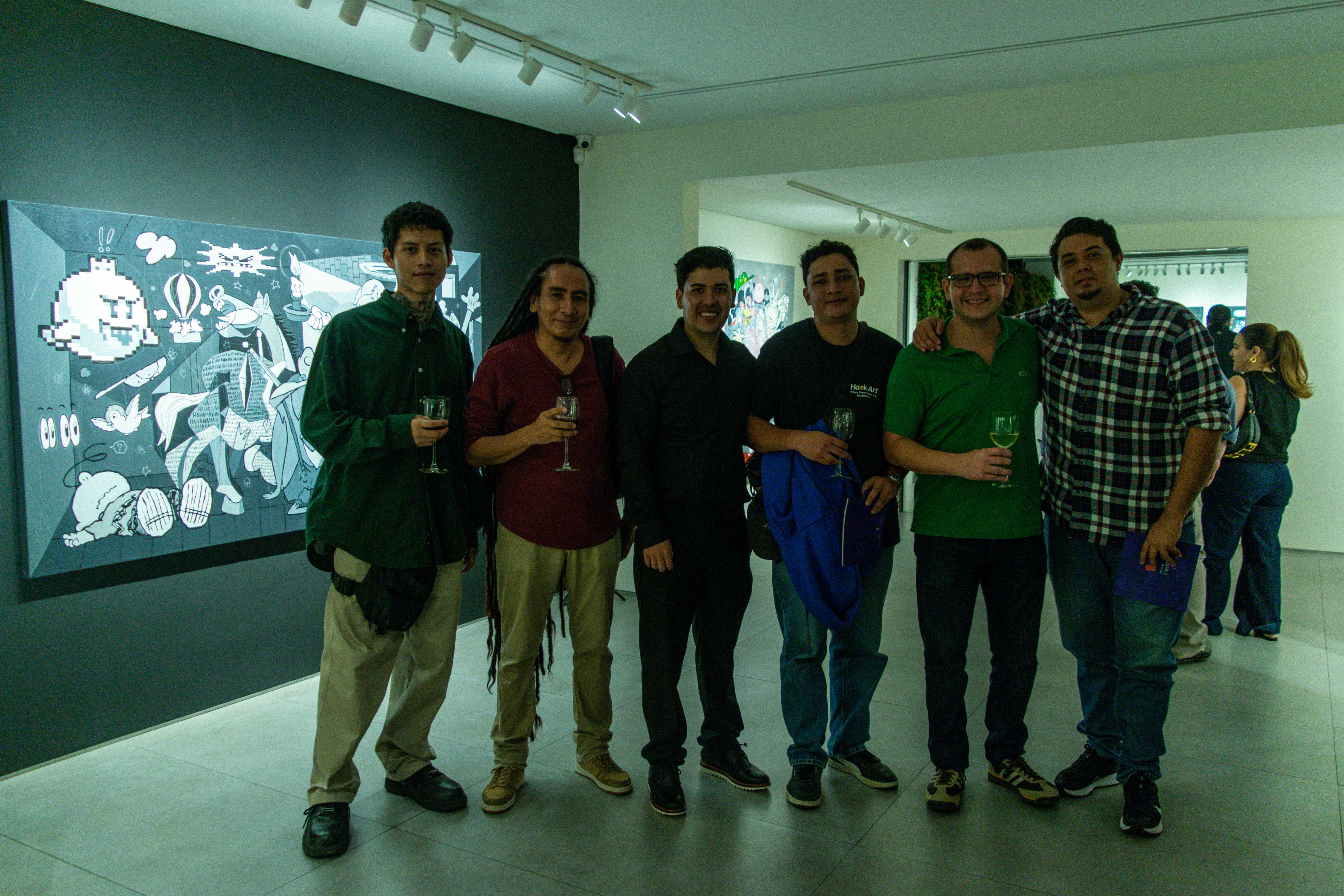 Finalmente, Contacto marca un punto de inflexión. A diferencia de la mayoría de las piezas, su composición se despoja del exceso para volverse signo, escena fundacional. Sobre un fondo negro absoluto —como el espacio exterior, como la página en blanco, como el misterio antes de la creación— flota la figura de un niño, casi un querubín, suspendido entre la inocencia y el asombro. A su alrededor, orbitan signos de lo lúdico y lo digital: los fantasmas de Pac-Man, platillos voladores, píxeles que recuerdan los primeros juegos de arcade. Pero el verdadero centro de la imagen no está en lo que rodea, sino en el gesto. El niño extiende su mano hacia otra que entra desde el borde derecho del cuadro, en una cita evidente —pero también invertida y tierna— de la creación de Adán de Miguel Ángel. Solo que aquí, el contacto no ocurre entre Dios y el Hombre, sino entre el niño y lo desconocido: el arte, el mundo, la imagen.