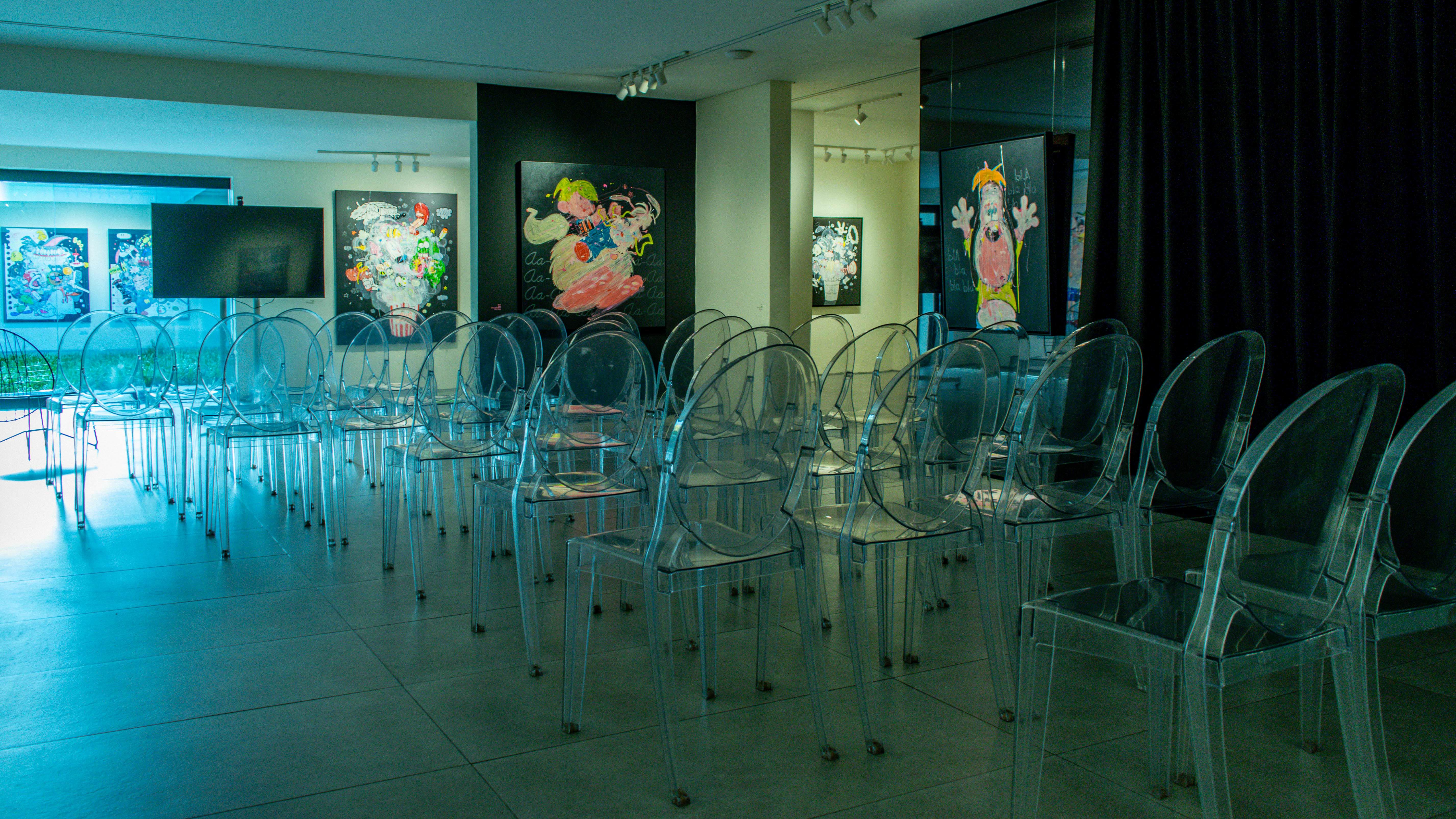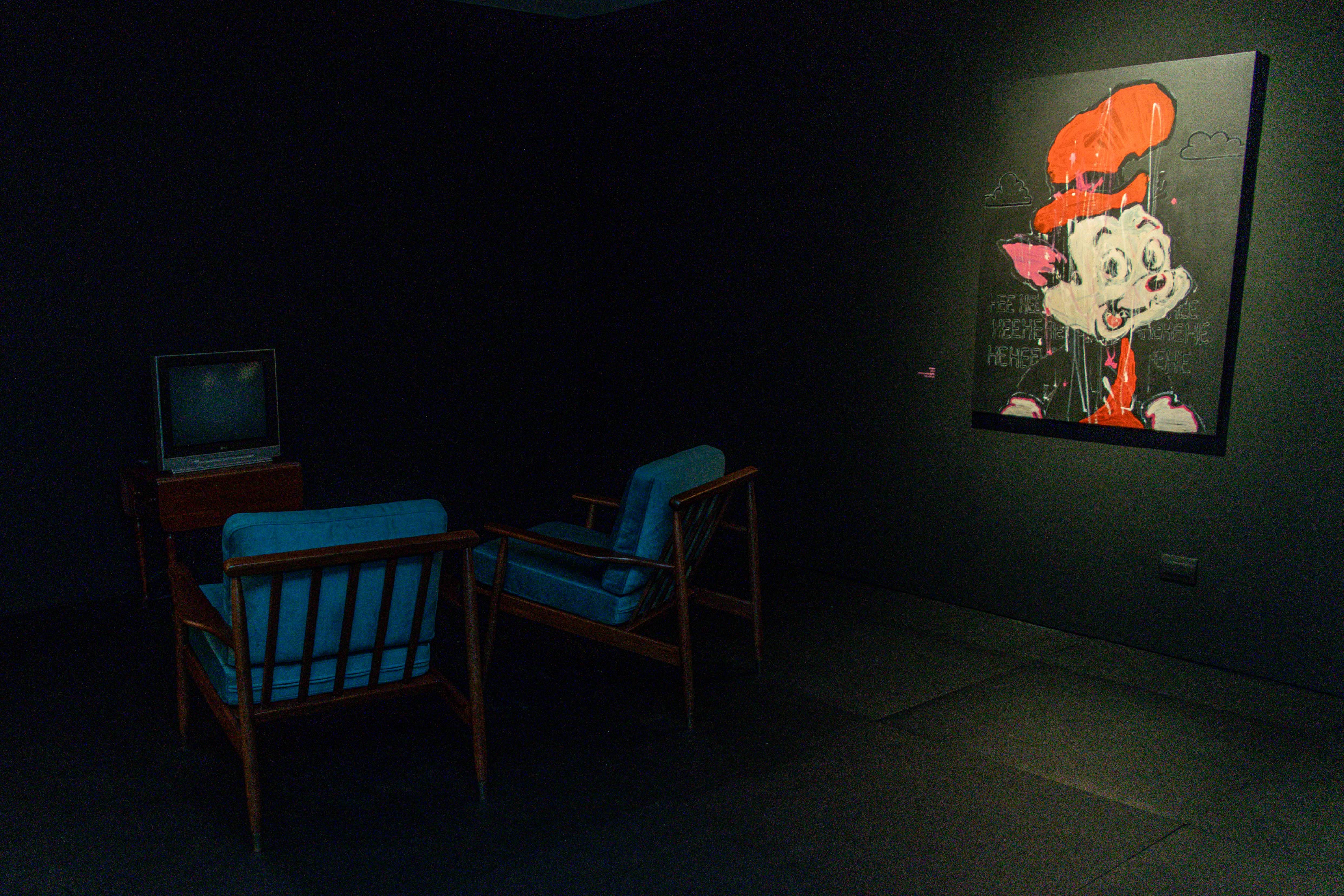 Una abertura entre cortinas negras ofrece la posibilidad de un escape, de una pausa. Al atravesarlas, el espectador accede a El refugio, un espacio, cerrado, íntimo, milimétricamente anacrónico. Allí, una vieja televisión transmite en bucle los dibujos animados que, décadas atrás, dieron forma al imaginario visual del artista. No hay ruido aquí. Solo una luz tenue y vibrante que alguna vez iluminó una sala familiar. La escena funciona como cápsula del tiempo, pero también como vientre simbólico: es el lugar donde todo comenzó.