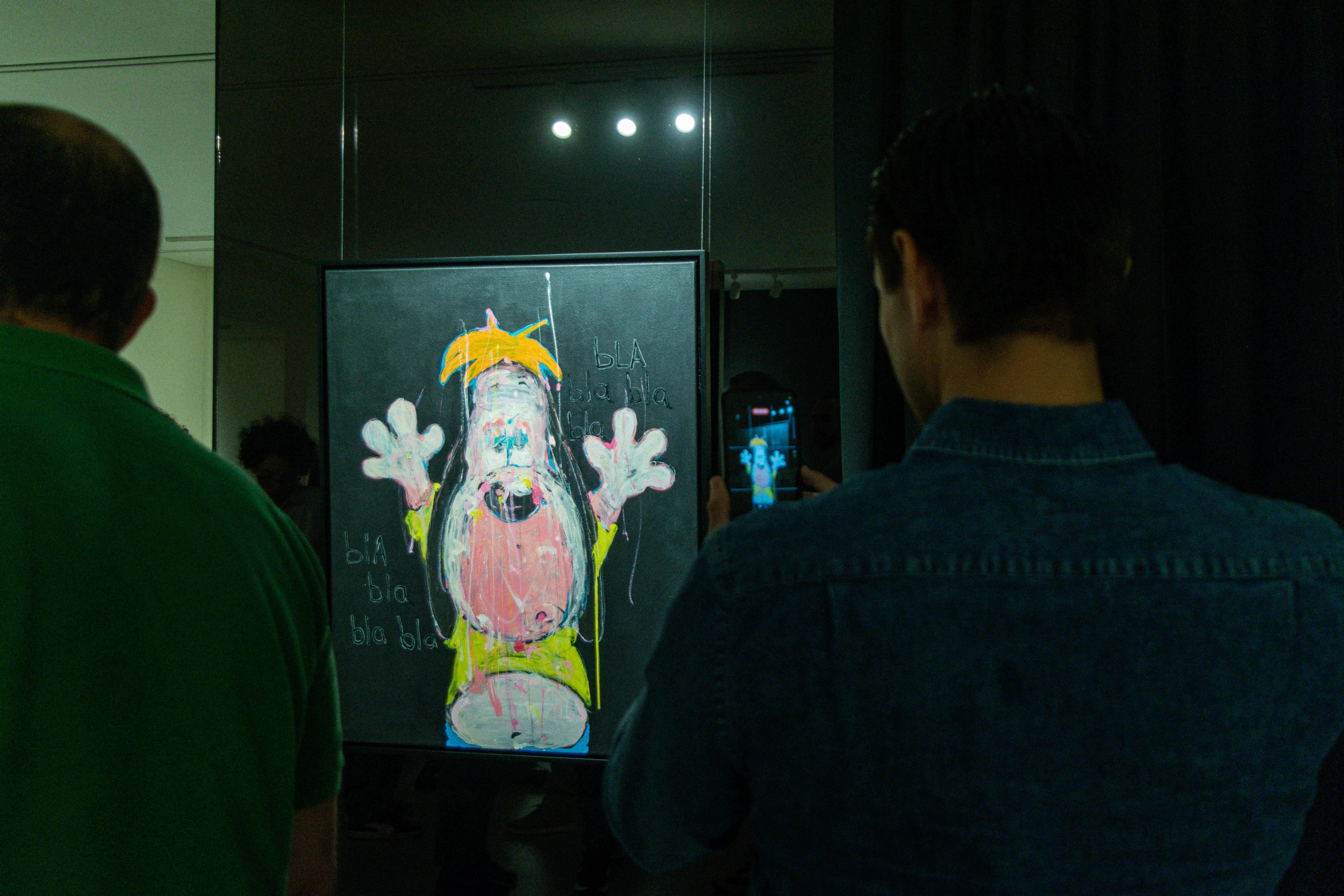 Por otro lado, obras como Sonreír y Stop, no narran, ni ilustran. Son imágenes donde la figura central, deformada y empastada, nos recuerda un poco el trabajo previo del artista, como restos de su antigua vida. Goofy o Charlie Brown, íconos del humor inofensivo, aparecen como cuerpos atrapados en una expresión —entre el asombro y la exasperación—. Sus manos alzadas no saludan ni aplauden: detienen, identifican, se agotan en su propio gesto. El fondo monocromático, el trazo bruto y la repetición insistente de la onomatopeya, grabada en tiza, refuerzan la sensación de que no existe aquí una intención narrativa. Este es simplemente el momento exacto en que el exceso ya no divierte, ya no comunica. Por ello ambas piezas resultan profundamente honestas: como si no buscaran hablarnos a nosotros, sino consigo mismo, reflejadas en el espejo de una cultura que ha perdido el control de sus propios íconos. Así, justo cuando el vértigo se advierte como total, el recorrido de la exposición se interrumpe.
