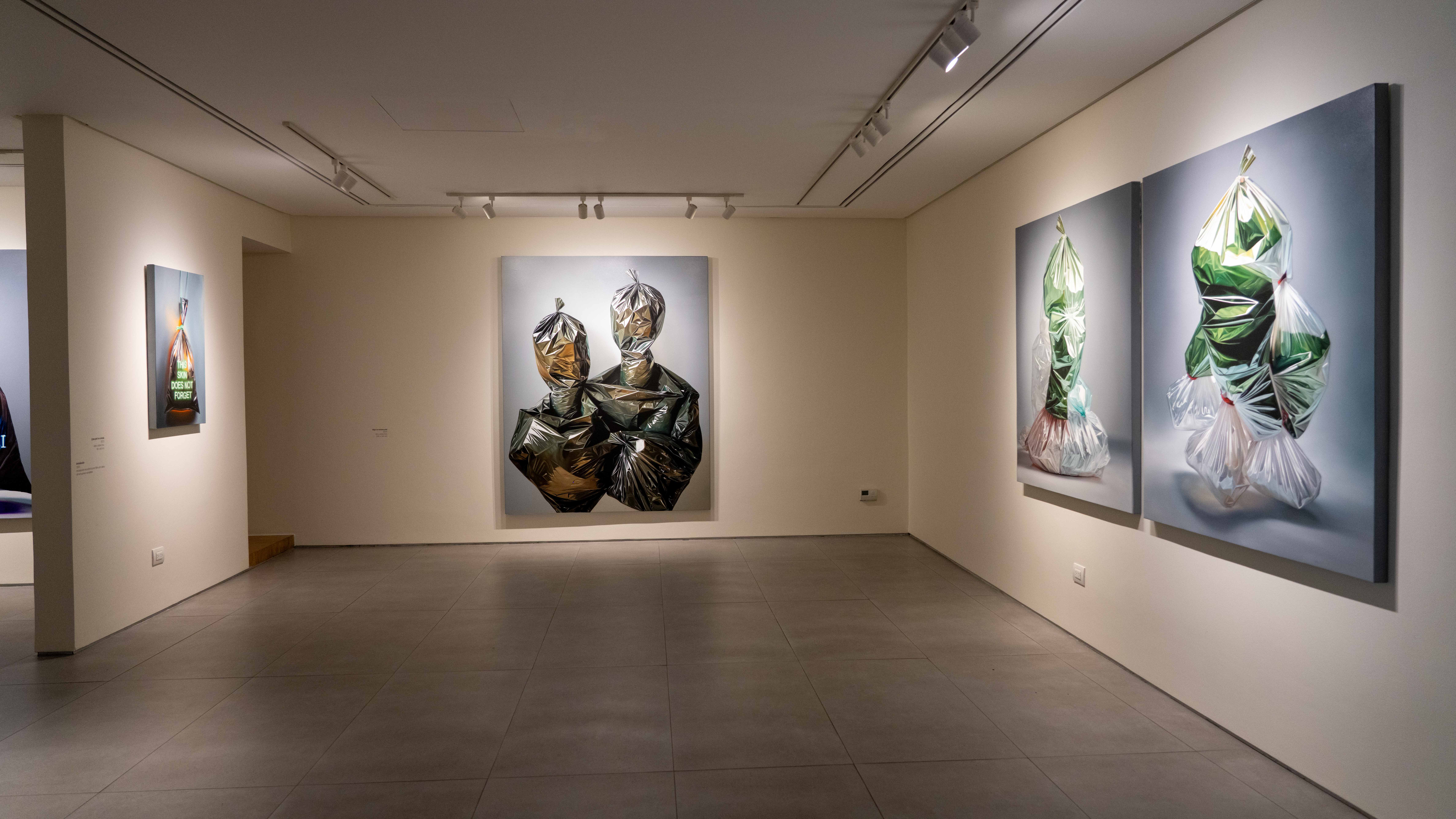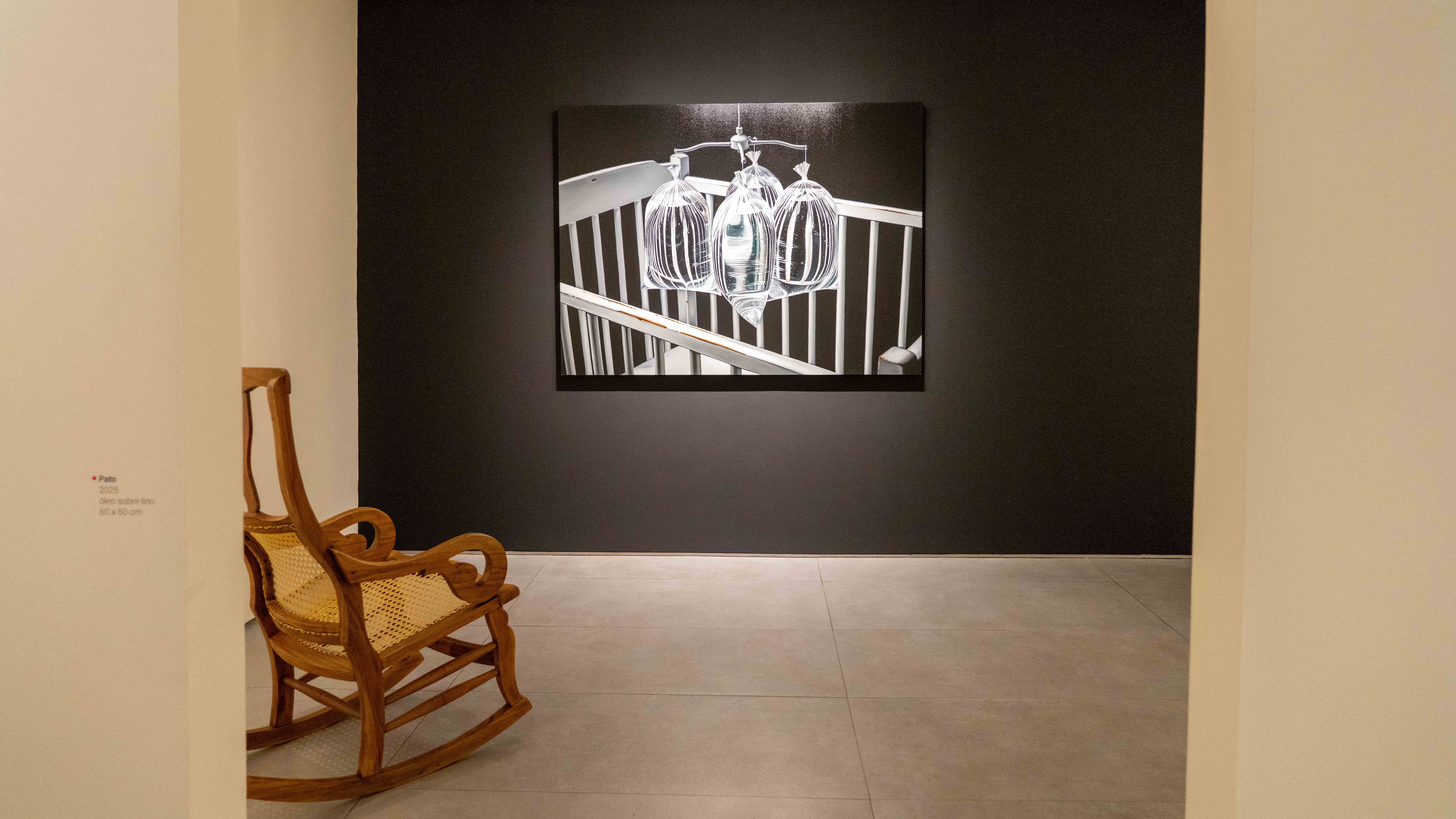 Así, en series como Convenciones (2020) o Celulosas (2024), vemos un desarrollo técnico increíble del pintor, del observador del mundo y sus formas naturales. Aquí las bolsas y el plástico son solo una excusa para mostrar, desde la pintura, el comportamiento de la luz sobre distintas superficies, y la forma en que estimula nuestras mentes. Misiles (2022), por otro lado, combina bolsas y juguetes de plástico tipo Lego, en una suerte de surrealismo lúdico con tintes de comentario social. Luego, casi como precursores temáticos de esta exposición, ha creado series como Balloons o Apropiaciones (2023), que indagan en la identidad del artista, rescatando imágenes y recuerdos de su infancia, que luego convierte en símbolos y metáforas. Estas series, aunque diversas en tono y procedimiento, han evolucionado en un universo coherente y fácilmente identificable, que crece como una suerte de tela de araña, alrededor de un mismo eje o motivo, pero con múltiples puntos de contacto a otros planos de la realidad.