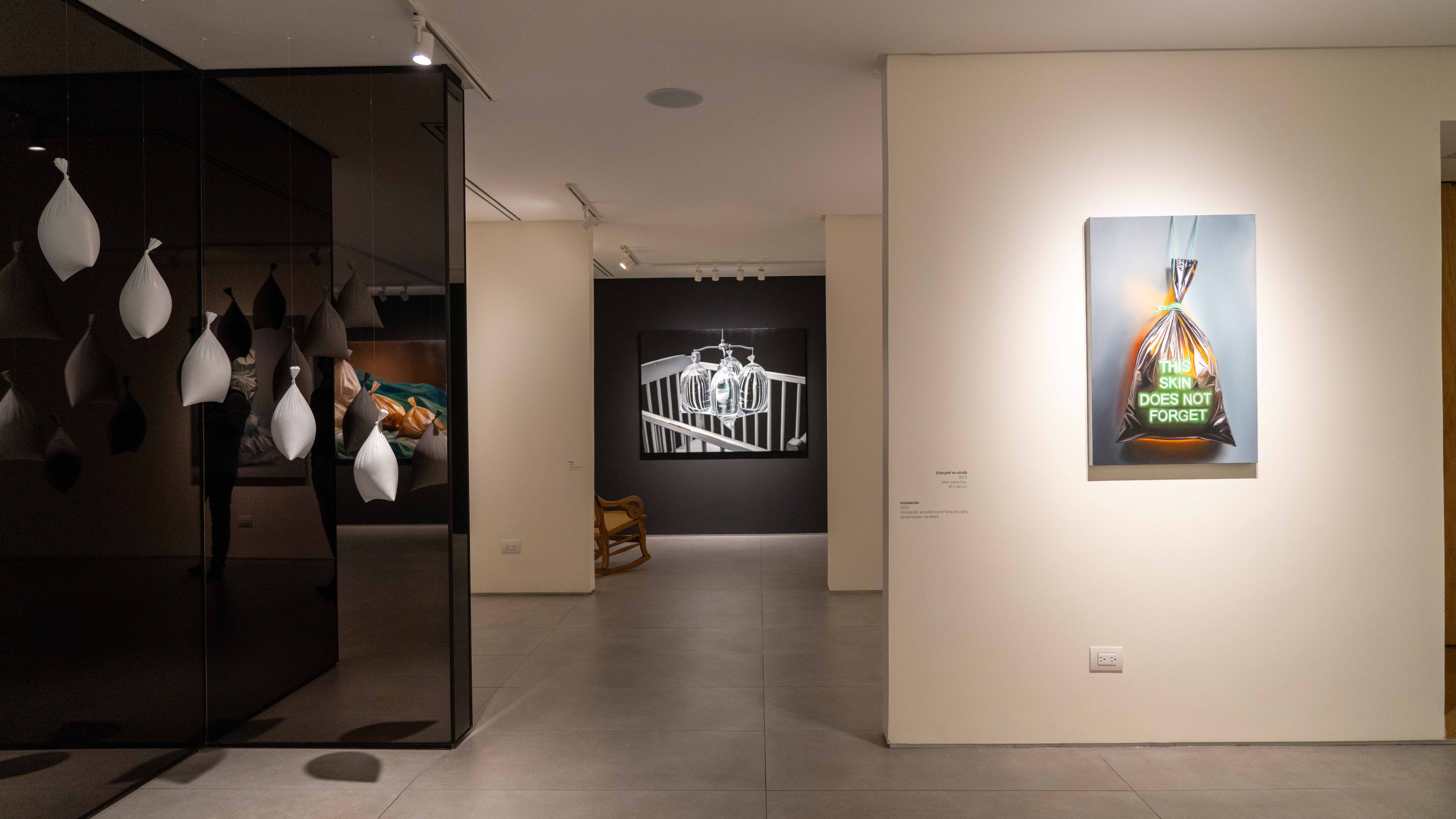 Sin embargo, hay un nivel más íntimo, más silencioso, que atraviesa todas estas capas: la memoria. Obras como Esta piel no olvida (2025) y Nada es para llevar, todo es para vivir aquí (2025) se sitúan en ese plano, transformando las bolsas plásticas en depósitos de recuerdos iluminados. El resplandor del texto en neón sobre la fragilidad del plástico convierte a cada bolsa en un archivo poético, un relicario de momentos que insisten en permanecer con nosotros. Aquí ya no se trata de lo que podemos llegar a ser, ni de las raíces que evocamos, sino de aquello que se resiste al olvido: fragmentos de la vida que cargaremos por siempre, como un equipaje invisible. La piel de ese primer gran amor, una derrota terrible, o el sabor de una cerveza helada entre amigos en pleno verano; son los instantes que nos forman, que nos recuerdan constantemente quiénes somos.