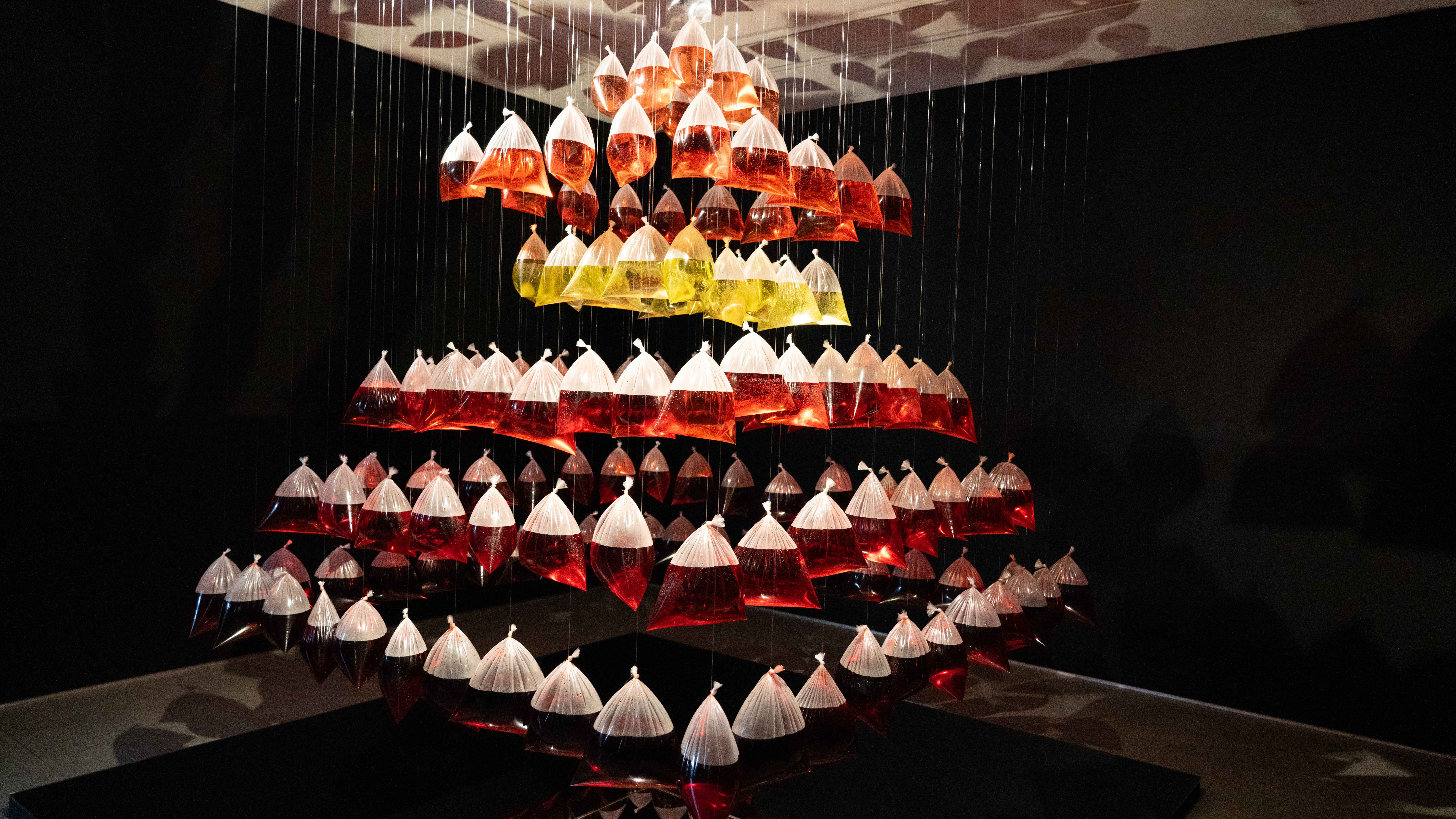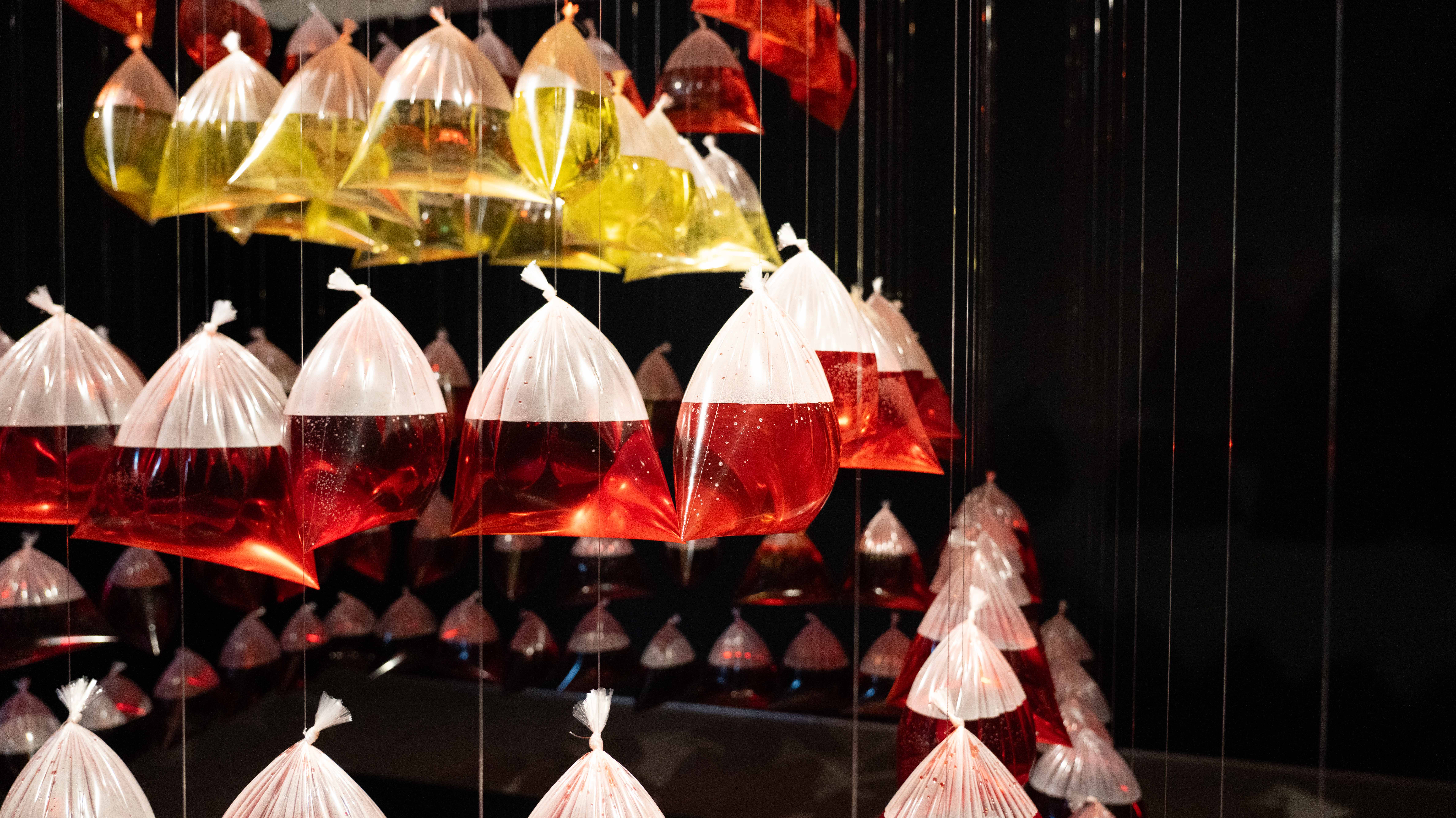 En el otro extremo de la sala, un bloque de cientos de bolsas de plástico flotan en el aire. Disección (2025) presenta un cuerpo etéreo, ajeno, como una fuerza sobrenatural que pertenece a otro mundo. En los distintos colores del líquido que contiene se vislumbra una degradación de tonos cálidos que recuerdan la piel, los músculos, el corazón, el recuerdo, la memoria.